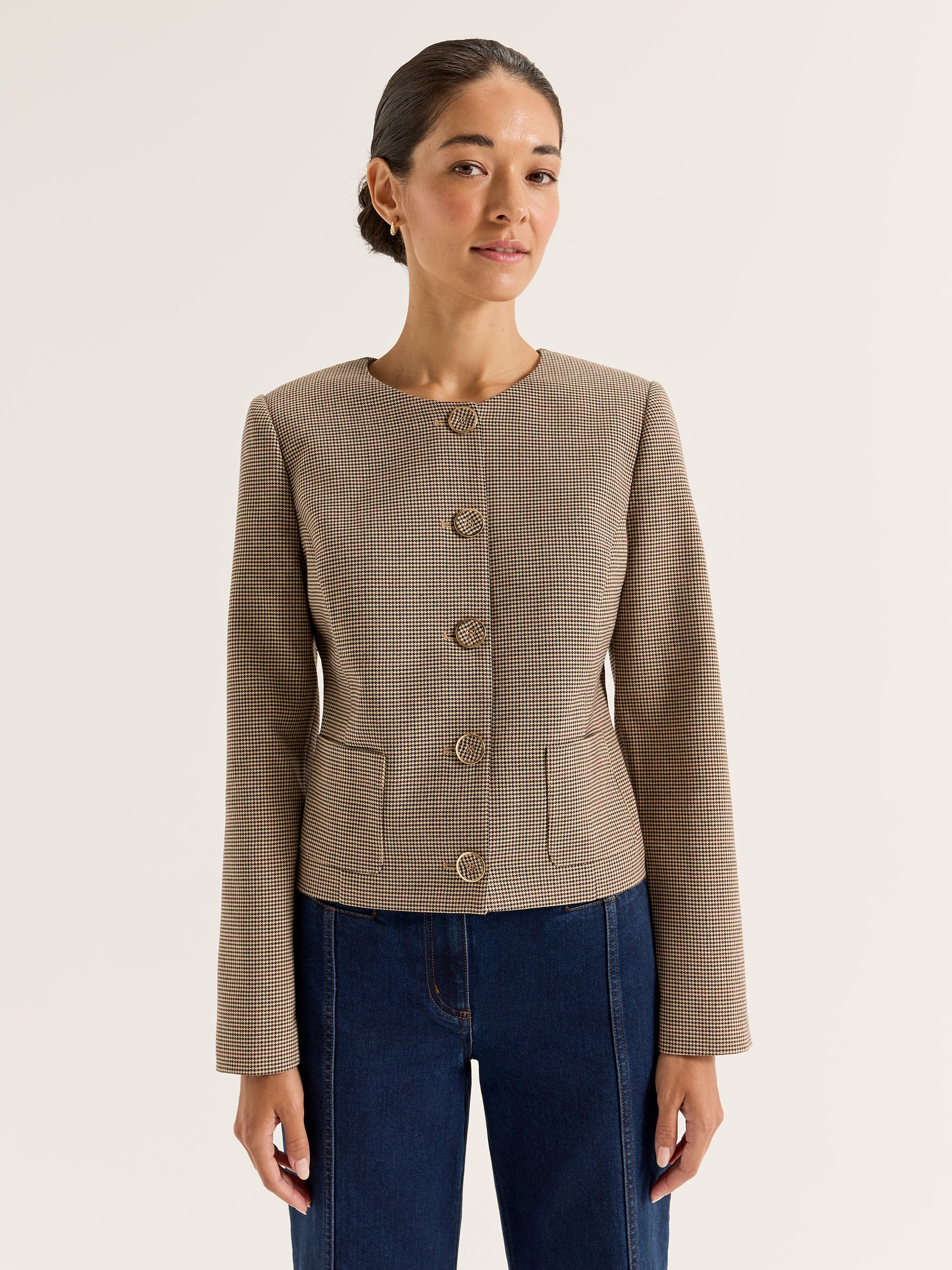 Tap into the workwear trends of the 80s with our Annie Check Jacket. Picture it: big hair and even bigger shoulder pads - it was a real moment! The Annie Check Jacket takes the best parts of the trends (specifically the shoulder pads) and offers a refined, modern take that can seamlessly slot into your modern wardrobe. Cut to a cropped fit with full length sleeve, the Annie Check Jackets features a small houndstooth check pattern all over with matching patterned buttons down the front. Complete with a flattering round neckline and patch pockets, this sleek jacket adds the perfect corporate-chic touch to any outfit and looks especially good when paired with the matching Annie Check Pants.