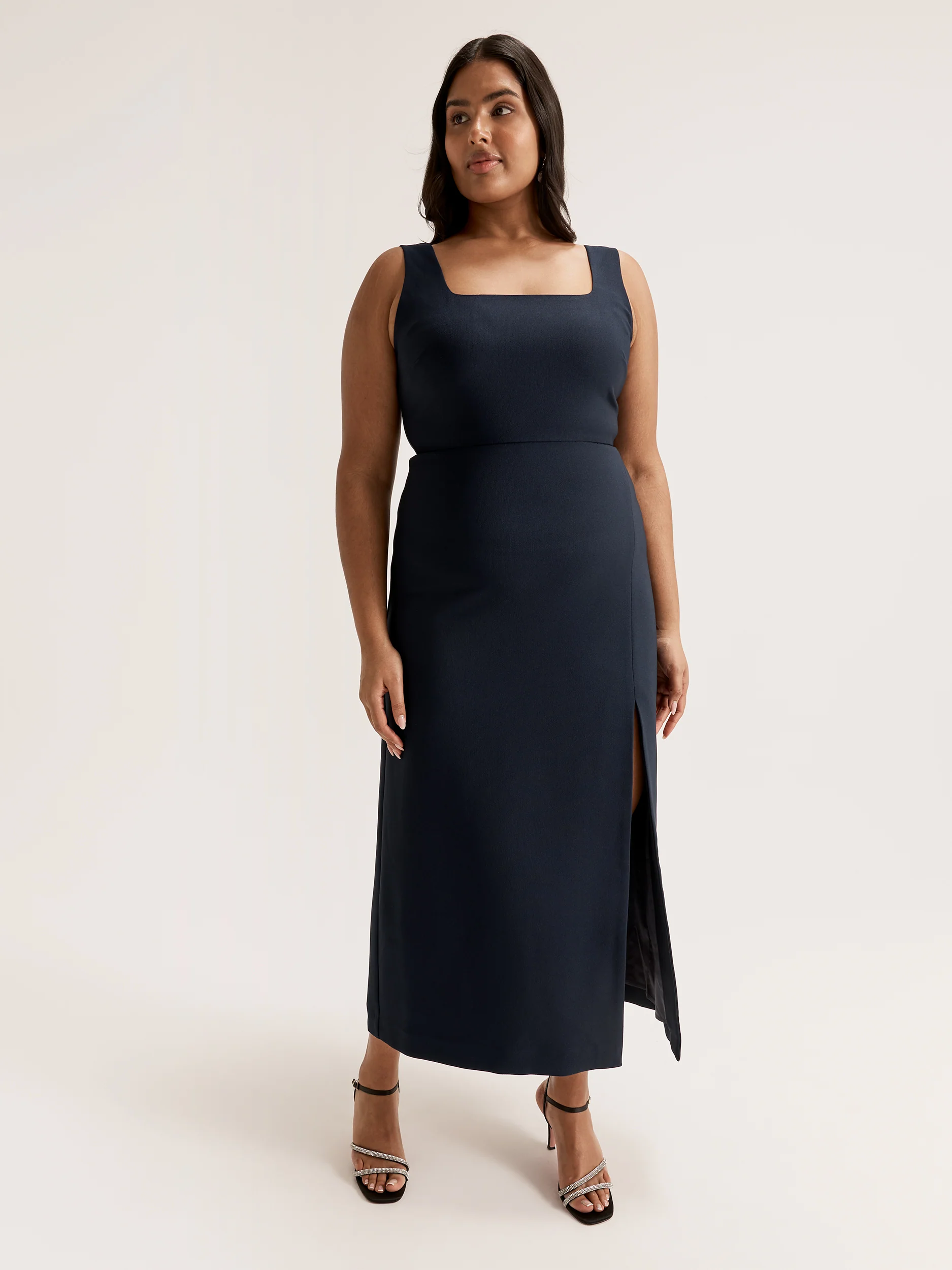 An instantly flattering dress style for bridesmaids of any shape or size, the Review Review Occasion Barcelona Maxi Dress makes a wonderful choice for styling a bridal party in a modern, contemporary look. A versatile style that can be reworn to corporate events, birthdays, and black tie events once the wedding is over, or a great choice for a bridal shower look, the Barcelona Maxi Dress in navy blue is made from a comfortable stretch crepe fabric with stretch satin lining and features a sleeveless fitted bodice with square neckline and straight column skirt with a sexy thigh high split. The Barcelona Sleeveless Review Occasion Dress is cut to a maxi length that falls just above the ankle.