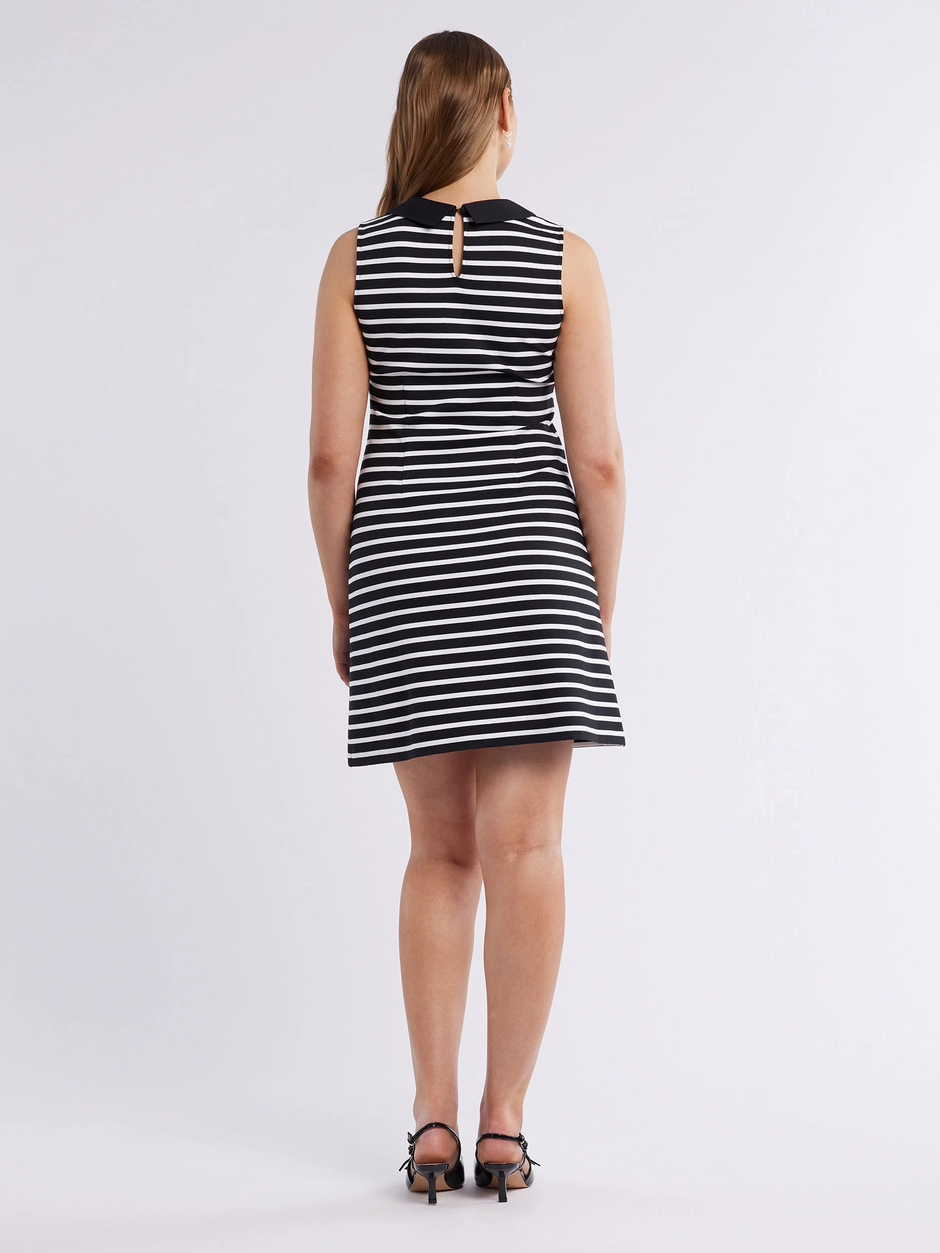 Embrace contemporary chic with the Beatnik Ponte Dress. The sleeveless shift silhouette, crafted from stretch ponte fabric, features a striking black ponte collar. A back neck keyhole with button fastening adds allure, while non-functional black pocket welts adorned with gold buttons enhance the above-knee length dress in captivating black and ivory stripes.