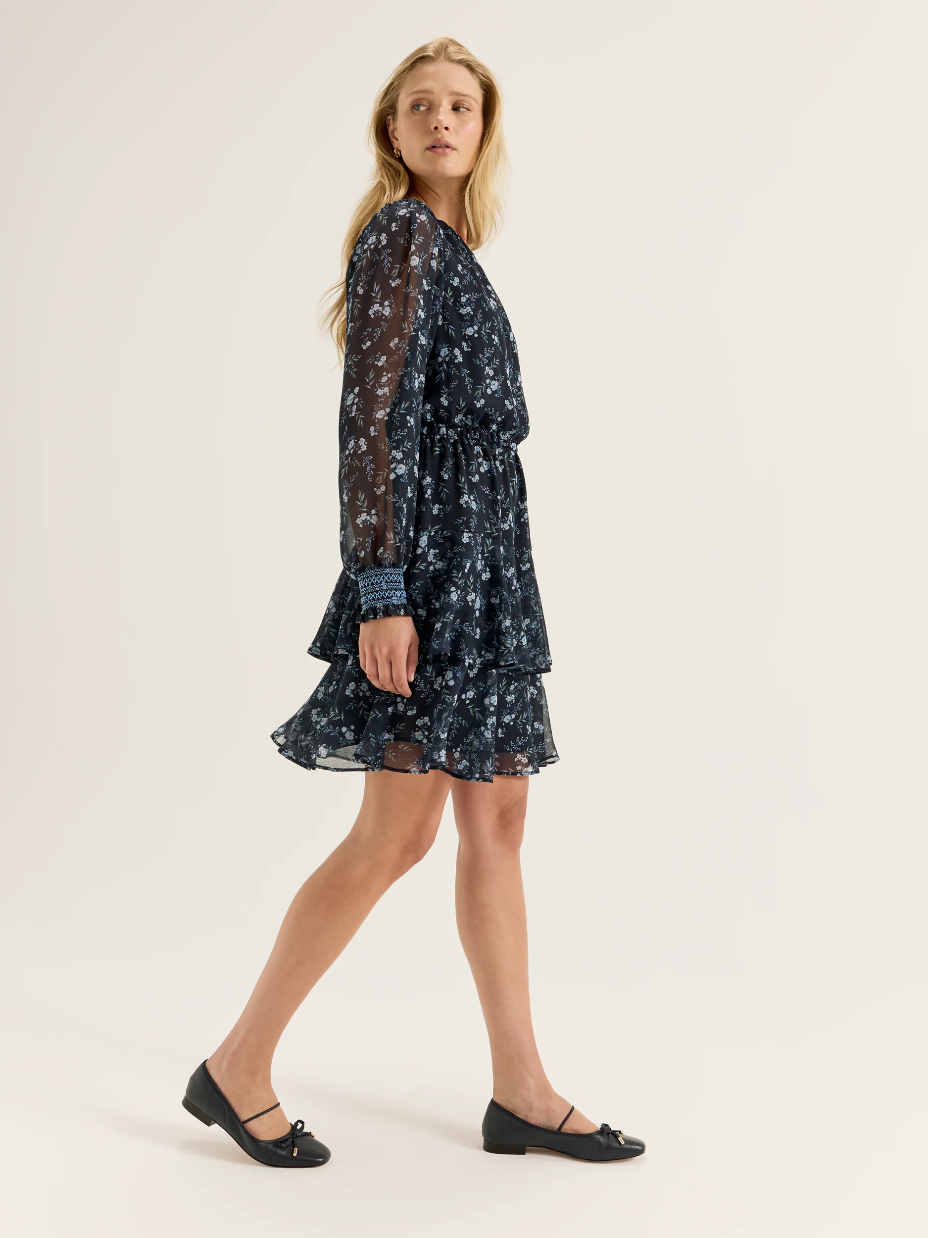 Delicate florals, rich palettes, and feminine silhouettes are a true signature of Review. The Bluebell Mini Dress combines all these elements to bring you a style that is perfect for any season; with cool winter blues front and centre, this dress features a precious ditsy floral print set against our rich ink navy for a lush contrast that is emblematic of the season ahead. Made of a lightweight, semi-sheer fabric, the Bluebell Mini Dress is cut to a slightly relaxed fit with a round neckline, long sleeve with contrast embroidery on the cuffs, an elastic waistband and tiered ruffle skirt. Accentuated with a front keyhole and button feature, this easy pull-on dress can be styled over stockings and tights with sleek winter boots, or your comfiest flats and a chic overcoat for effortless day to night outfitting.