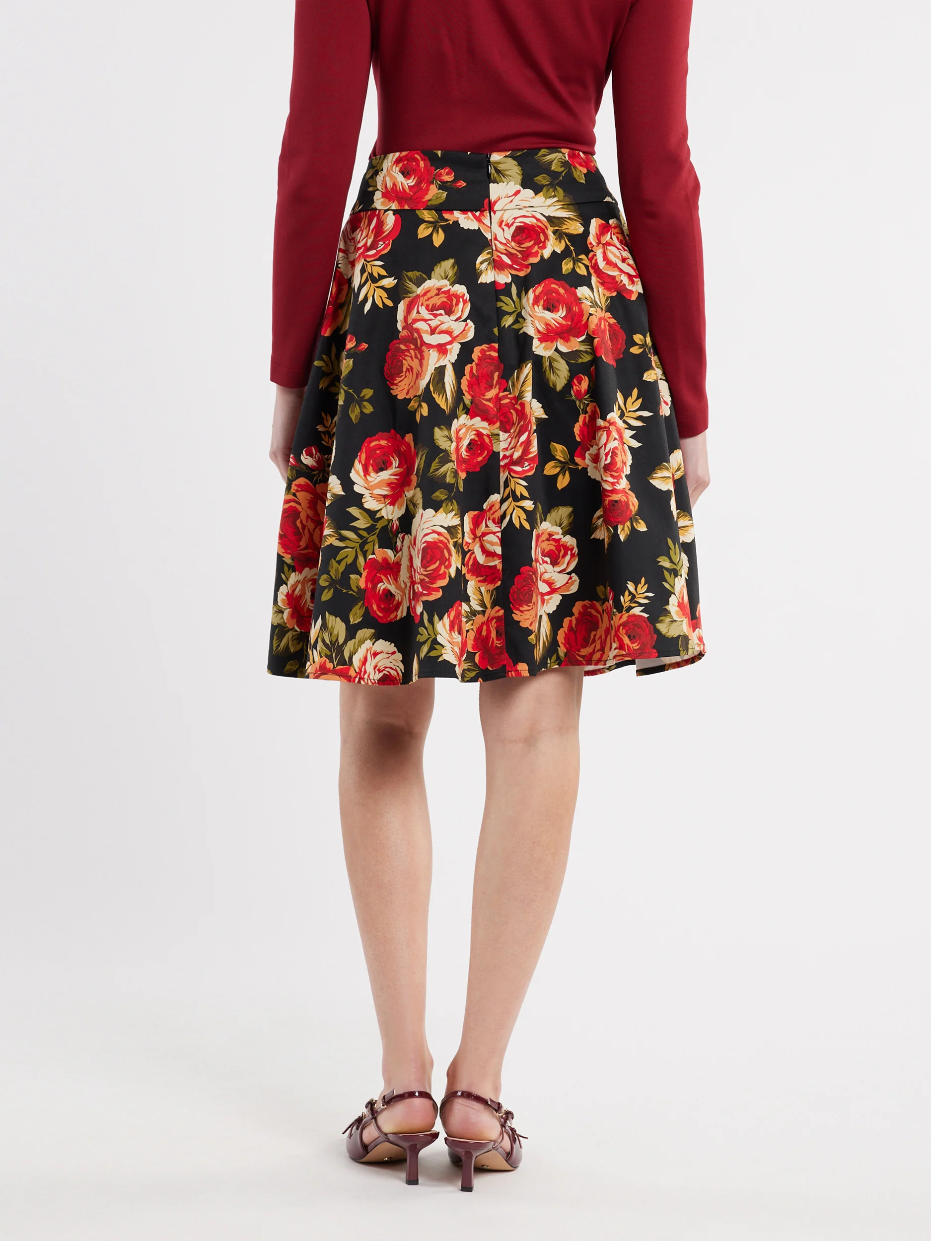 Dark, moody, an ethereal beauty - our new Edith Bloom Skirt is the perfect autumn prom for adding to your collection. Made of our signature cotton sateen fabric, the Edith Bloom Skirt feels luxuriously soft and smooth and features a large floral print in a rich autumnal palette of deep reds and peach oranges against a black base. A classic prom silhouette, the Edith Bloom Skirt has a high waisted fit with structured waistband and full circular cut that sits just above the knee, finished with a centre back invisible zip closure and side pockets for your essentials. Style this piece with your favourite knitwear and tees in rich red tones for a playful look, or keep it simple with all black tops and accessories.