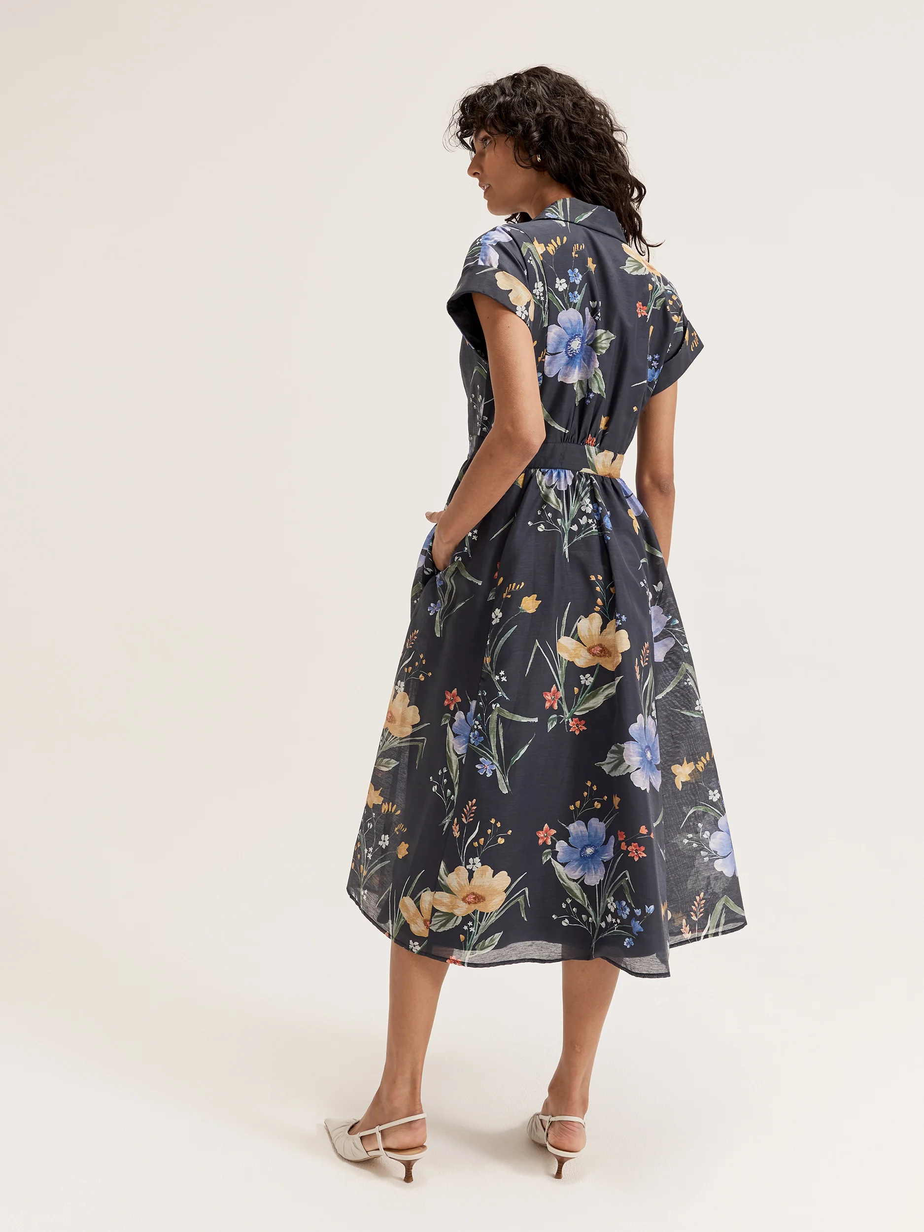 The In The Meadow Dress features a navy base with vibrant orange and yellow floral print. Crafted from a linen blend fabric and fully lined, it has short sleeves, a collared v-neckline, and a button-through front. The fitted bodice, midi length, flowy skirt, and side seam pockets complete this charming design.