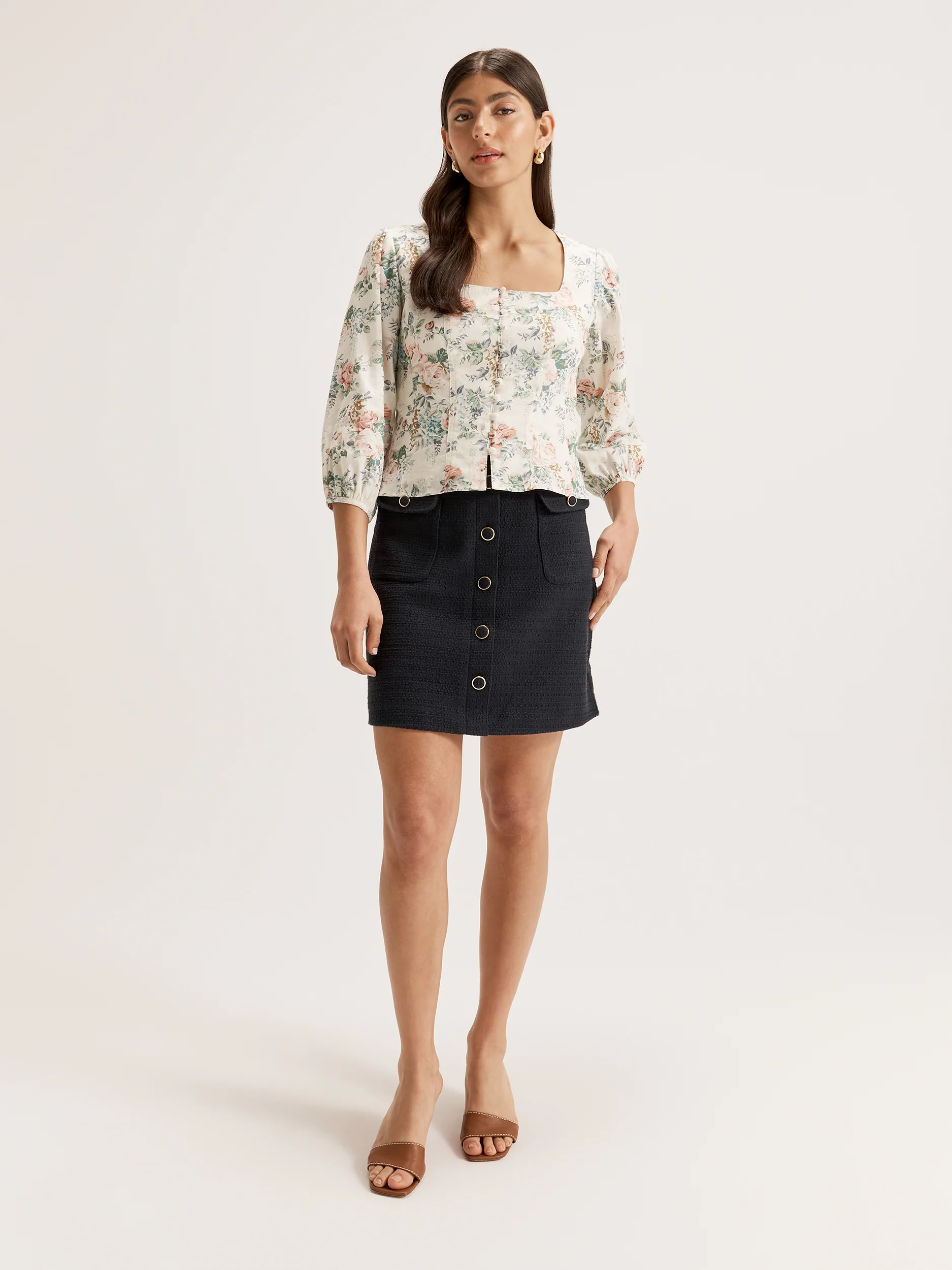 The La Bella Blouse is here to give your wardrobe the touch of regency your wardrobe needs. Made from a luxe linen blend fabric with our latest floral print, the La Belle Blouse is a stunning corset style top with button down front and panel detailing through the bodice to create a slim fit that shows off your curves without the need for painful boning and wires. With an open square neckline and 3/4 length puff sleeves, the La Bella Blouse looks fab with light denim for weekend drinks or a structured skirt for your 9-5 routine.