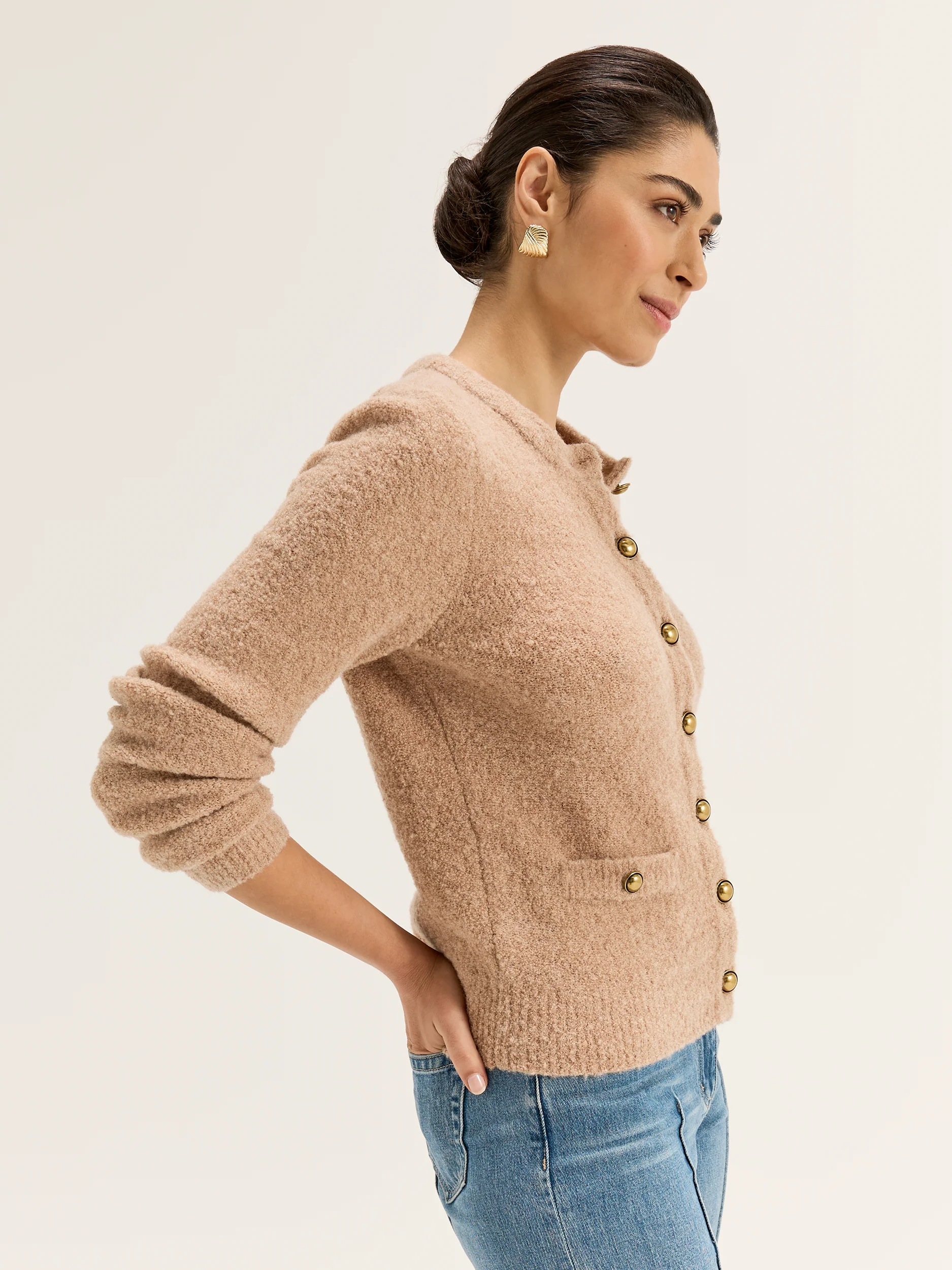 Embrace cosy textures this season with the Leo Boucle Jacket! This vintage inspired wardrobe essential is made of a lush wool blend knit with a soft and supple boucle texture throughout, giving the Leo Jacket a luxe feel. Cut to a fitted silhouette, the Leo Boucle Jacket features a round neckline, long sleeve with ribbed cuffs, and a button through front complete with gold dome buttons. Worn as a light layering piece or outfit hero, the Leo Jacket can be styled with everything in your wardrobe.