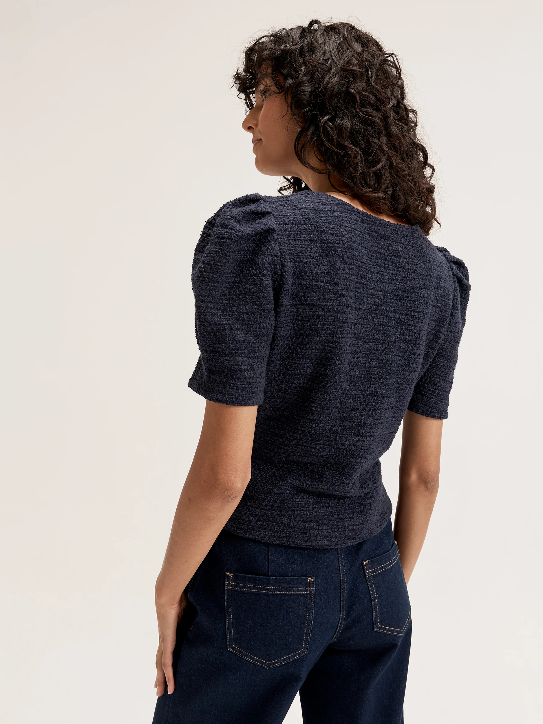 The Marina Top in ink ponte tweed boasts a boucle texture with a soft handfeel. Featuring a round neckline and short puffy sleeves, it is accented with gold-rimmed button detailing on the shoulder. This form-hugging top combines elegance and comfort for a chic, modern look.