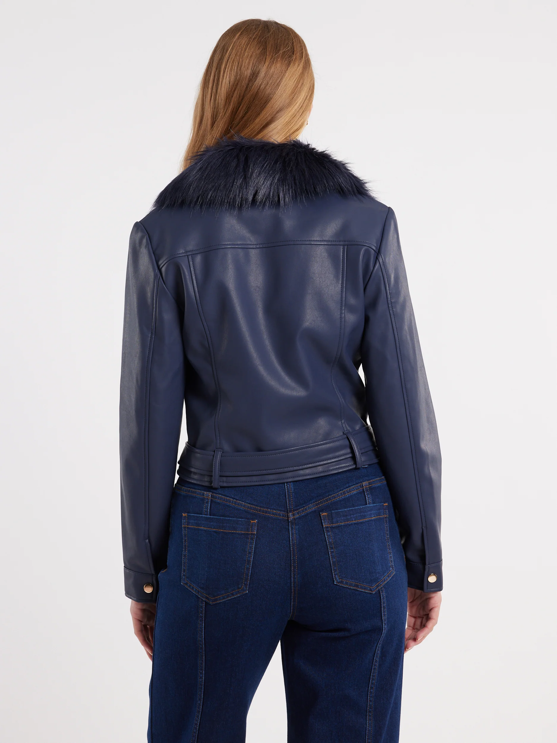 Add a little edge to your casual outfits with our new it-girl, the Roxanne Jacket! This jacket is an absolute must-have for the season ahead, with its biker inspired design that will look fabulous with all your dresses and separates. The Roxanne Jacket is made of a luxe vegan leather fabric with a smooth matte finish and contrasting faux fur collar for added warmth. The Roxanne Jacket is a slim fit style that's cut to a chic cropped length with zip closure, zip pockets, and belt detail along the hem. Available in a light biscuit brown and classic navy blue, this jacket pairs best with our essential denim for everyday outings but can instantly elevate your dressiest outfits for special occasions.