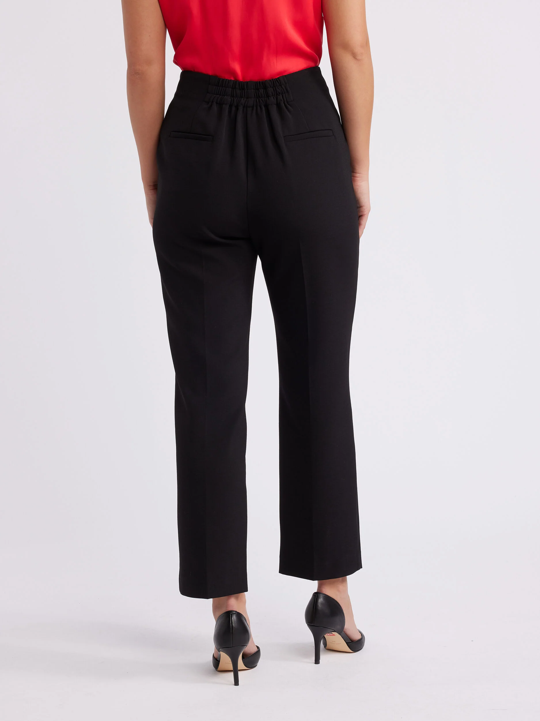 Discover unparalleled sophistication with our Sophie Crepe Pant. In classic black, these straight-leg pants feature a leg crease detail, high waist, and waist darts for a tailored fit. The fly front with hook and eye closure ensures ease, while the elastic insert at the centre back waistline guarantees comfort. Functional side pockets complete the look. Combine with our Sophie Cape Blazer for an effortlessly chic ensemble that's perfect for any Review Occasion.